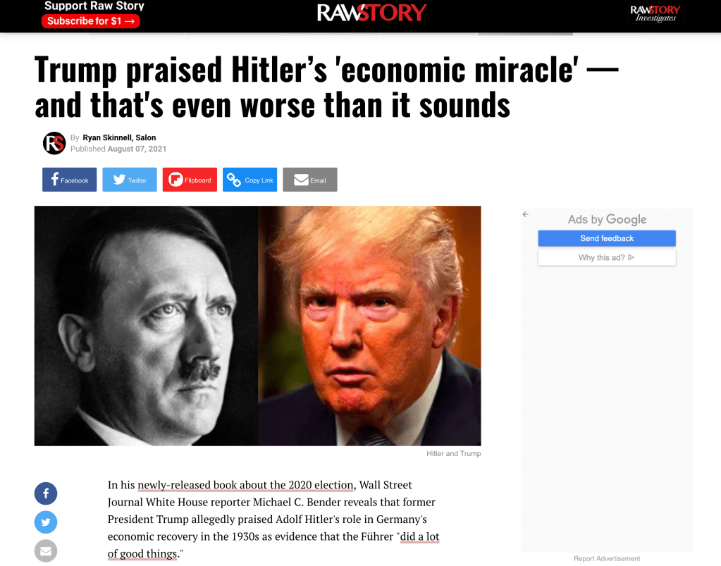 In his newly-released book about the 2020 election, Wall Street Journal White House reporter Michael C. Bender reveals that former President Trump allegedly praised Adolf Hitler’s role in Germany’s economic recovery in the 1930s as evidence that the Führer “did a lot of good things.” Read the rest at: https://www.salon.com/2021/08/07/trump-praised-hitlers-economic-miracle–and-thats-even-worse-than-it-sounds/
